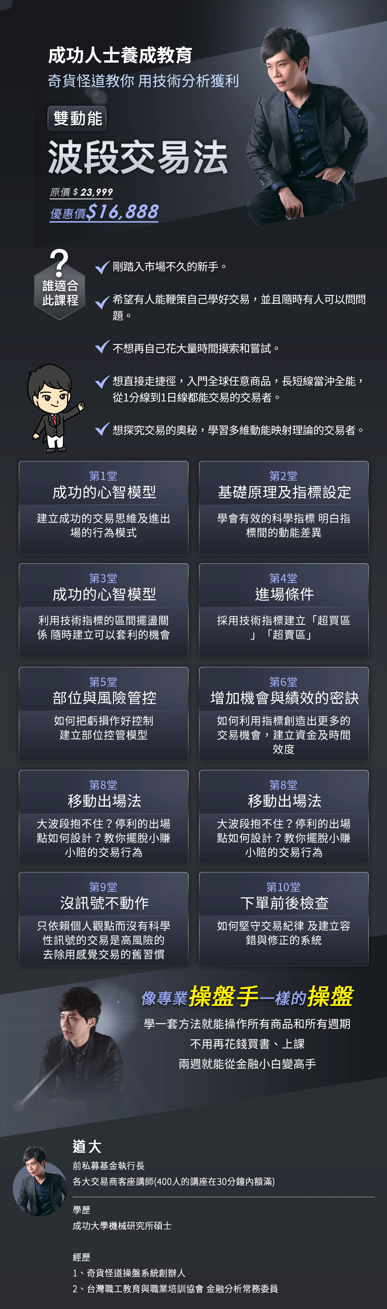 2008年我開始投入金融教育,才深感覺到台灣的操盤知識落後國外至少五十年。 2013年,我正式開始金融培訓,創造奇貨怪道操盤教育體系,並引進國外最新的操盤技術。